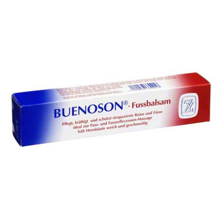 Buenoson-Fussbalsam enthält hochwertige Pflanzen-Auszüge aus Johanniskraut, Wacholder, Gewürznelke, Birke, Hopfen, Enzian und Wurmfarn sowie wertvolle Pflanzenöle aus Avocado-Frucht, Weizenkeim und Erdnuss. Die regelmäßige Anwendung von Buenoson hält die Haut der Füsse weich und geschmeidig und beugt der Bildung lästiger Hornhaut vor. Insbesondere im Bereich eines verformten Fussballens bilden sich oftmals schmerzhafte Verhornungen der Fusshaut. Diese werden durch Buenoson bereits nach kurzfristiger Anwendung stark vermindert und verschwinden bei intensiver Behandlung meist vollständig. Die Salbe löst die starke Oberflächenspannung der Hornhaut; Schwielen und rissige Fusskanten bilden sich langsam zurück und stoßen verhornte Haut ab, die sich beim Fussbad ablöst.