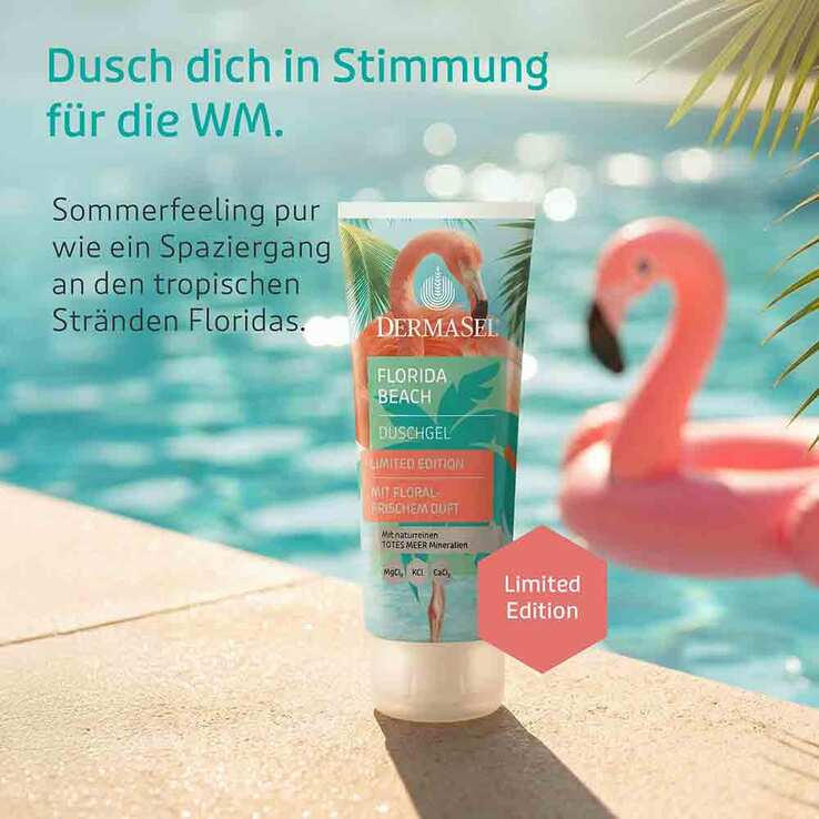 Das DermaSel® FLORIDA BEACH Duschgel entführt in die sonnenverwöhnte Leichtigkeit der amerikanischen Ostküste. Inspiriert von der Kraft des Meeres und dem unverwechselbar lebhaften Flair des WM-Gastgeberlands verwandelt diese Duschpflege jede Dusche in einen Mini-Urlaub am Strand. Schon beim ersten Kontakt mit Wasser entfaltet sich ein Duft, der an warme Sommertage, weichen Sand und glitzernde Meereswellen erinnert – ein Duft, der das Lebensgefühl Floridas auf die Haut bringt.