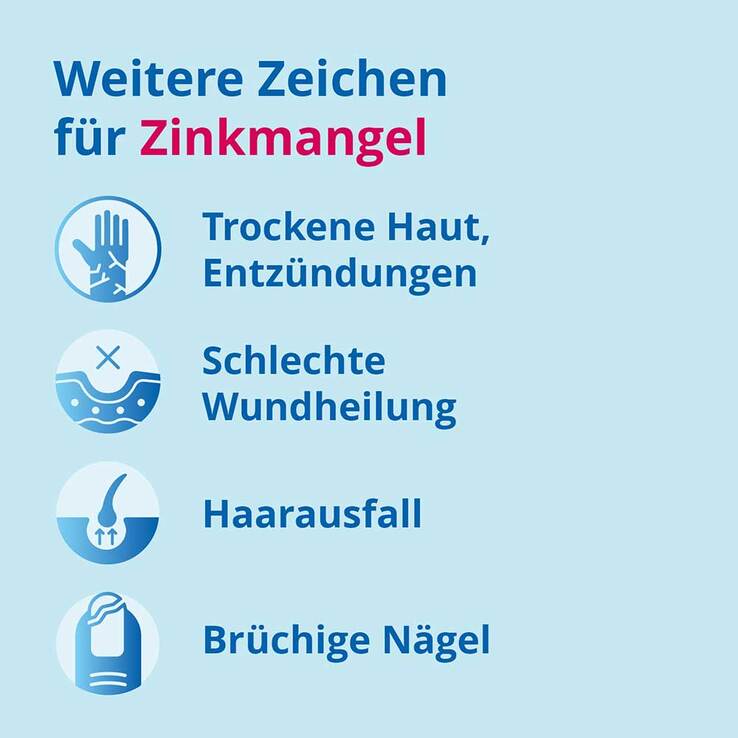Die Anzeichen eines Zinkmangels sind oft unspezifisch. Eine Mangelversorgung an Zink kann sich auf vielfältige Weise auswirken: Erkältungs- und Infektanfälligkeit, Pilzinfektionen, Lippenherpes, verzögerte Wundheilung, trockene Haut, brüchige Nägel mit weißen Rillen, kraftloses Haar, Haarausfall, Erschöpfung und Antriebslosigkeit können u.a. auf einen Zinkmangel zurückzuführen sein.