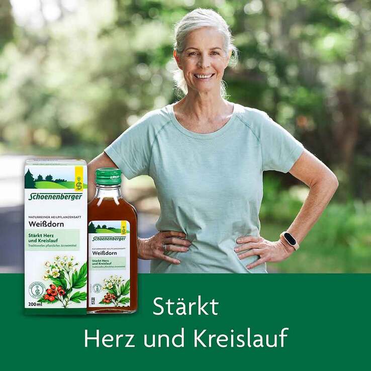 Pflichtangaben:Naturreiner Heilpflanzensaft Weißdorn Wirkstoff: Weißdornblätter mit Blüten - Presssaft Zus.: 100 ml enthalten: Wirkstoff: 70 ml Presssaft aus frischen Weißdornblättern mit Blüten (Crataegus monogyna JAQUIN, -oxyacantha L.) (1 : 0,63 – 0,90). Sonstige Bestandteile: Weißdornfruchtmark, Wasser. Anw.: Traditionelles pflanzliches Arzneimittel zur Unterstützung der Herz-Kreislauf-Funktion ausschließlich aufgrund langjähriger Anwendung. Gegenanz.: Allergie gegen Weißdorn. Nebenw.: Es können Magen-Darm-Beschwerden sowie allergische Hautreaktionen auftreten. Die Häufigkeit ist nicht bekannt. Walther Schoenenberger Pflanzensaftwerk GmbH & Co. KG · 71106 Magstadt