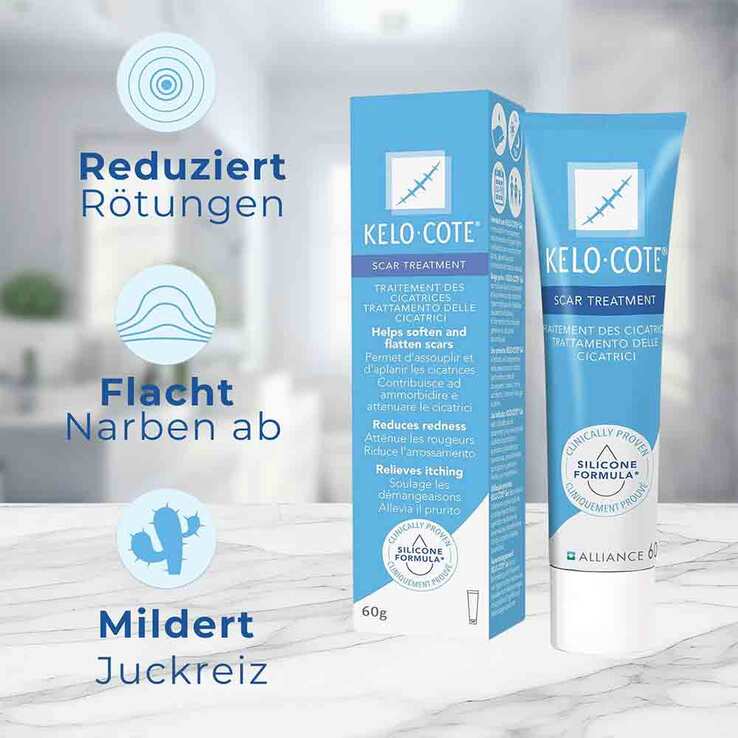 KELO-COTE® Narbengel ist ein selbsttrocknendes Silikongel zur Prävention und Behandlung wulstiger Narben, wie hypertropher Narben und Keloide. Durch KELO-COTE® Narbengel können Narben flacher, weicher und glatter werden. Mit Narben verbundene Beschwerden und der Juckreiz werden gelindert und die Hautverfärbung wird reduziert.
