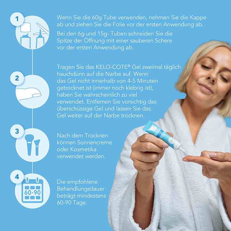 Tragen Sie KELO-COTE® Narbengel zweimal täglich hauchdünn auf die betroffene Hautpartie auf und lassen Sie das Gel trocknen. Wenn KELO-COTE® Narbengel nicht innerhalb von 3-4 Minuten getrocknet ist, haben Sie wahrscheinlich zu viel Narbengel verwendet. Entfernen Sie das überschüssige Gel vorsichtig und lassen Sie die Hautpartie dann weiter abtrocknen.