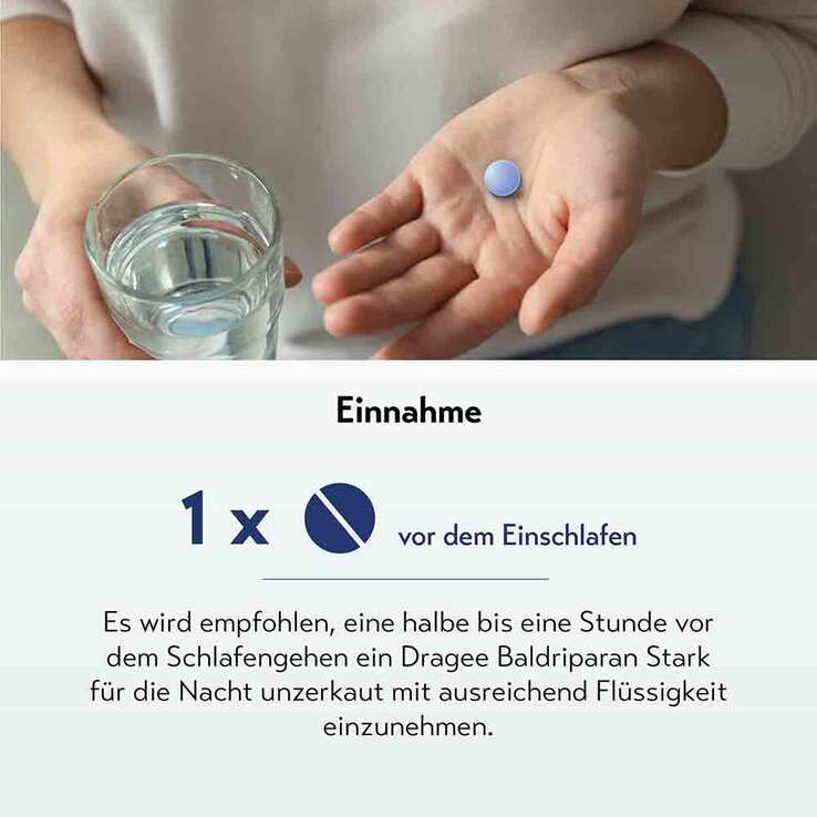 BALDRIPARAN STARK FÜR DIE NACHT. Wirkstoff: Trockenextrakt aus Baldrianwurzel. Zur Linderung von nervös bedingten Schlafstörungen. Enthält Sucrose (Zucker). www.baldriparan.de Zu Risiken und Nebenwirkungen lesen Sie die Packungsbeilage und fragen Sie Ihre Ärztin, Ihren Arzt oder in Ihrer Apotheke. PharmaSGP GmbH, 82166 Gräfelfing