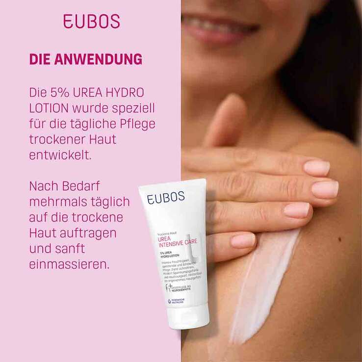 Aufgrund der angenehmen Textur und des sehr guten Einziehverhaltens ist die 5 % Eubos Urea Hydro Lotion besonders für die morgendliche Anwendung sowie bei warmen Temperaturen geeignet. Bei Bedarf auch mehrmals täglich anzuwenden.