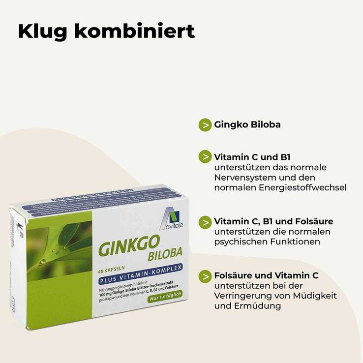Avitale Ginkgo-Biloba-Kapseln enthalten pro Kapsel 100 mg Gingko-Biloba-Blätter-Trockenextrakt, ausgewogen kombiniert mit den Vitaminen C, E, B1 und Folsäure, welche für die geistige Leistungsfähigkeit, den Energiestoffwechsel und das Immunsystem hilfreich sind.