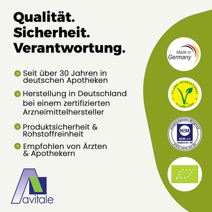 Avitale Ginkgo-Biloba-Kapseln werden aus sorgsam ausgewählten Rohstoffen erster Qualität durch einen zertifizierten Arzneimittelhersteller in Deutschland produziert. Avitale Ginkgo-Kapseln sind glutenfrei, laktosefrei und ohne Farb- und Konservierungsstoffe.