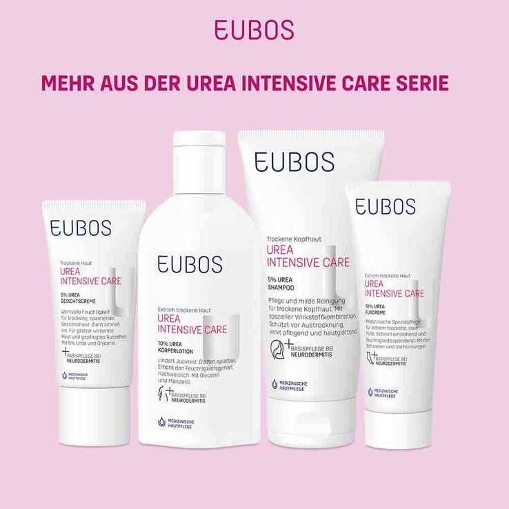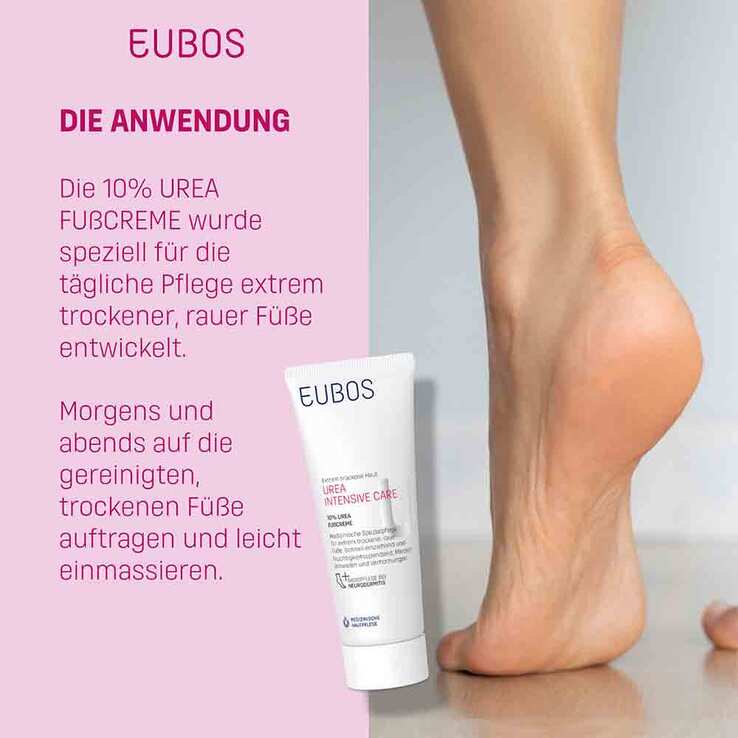 Die Eubos trockene Haut Urea 10% Fußcreme ist ein medizinisches Pflegeprodukt für extrem trockene Haut. Die Wirkstoffkombination verbessert den Hautzustand spürbar und hilft, vor Verhornung und Schwielen zu bewahren. 10% UREA und 5% Glycerin erhöhen die Hydrationsfähigkeit, helfen beim Lösen von Hautschuppen, bewahren vor Neubildung. Die Fußcreme enthält wertvolles Macadamia-Nussöl für Hautschutz und -pflege. Die komplette Eubos Urea Intensiv Care Serie ist für die wirkungsvolle Pflege trockener Haut geeignet. Auch Therapie begleitend, z.B. bei Neurodermitis und Psoriasis. Deren Verträglichkeit wurde dermatologisch getestet.