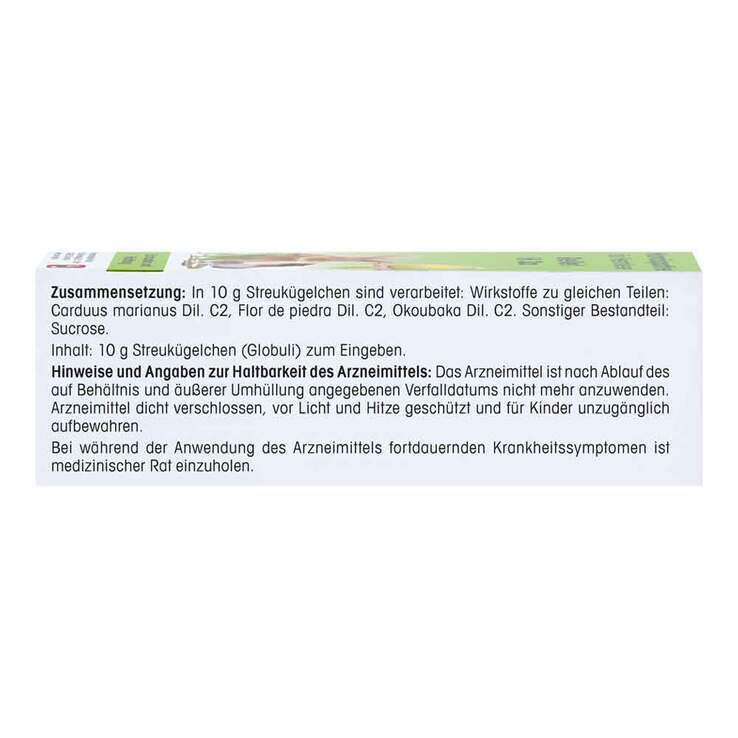 Die Streukügelchen enthalten zu gleichen Teilen Carduus marianus C2, Flor de Piedra C2, Okoubaka C2