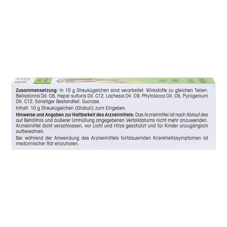 Die Streukügelchen enthalten zu gleichen Teilen Belladonna C6, Hepar sulfuris C12, Lachesis C9, Phytolacca C6, Pyrogenium C12