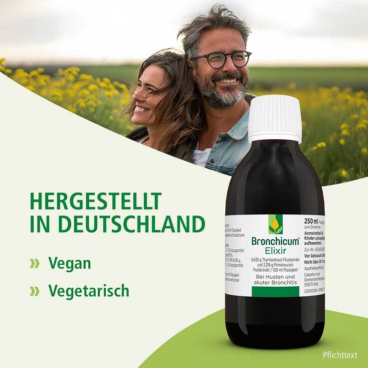 Bronchicum® Elixir. Anwendungsgebiete: Behandlung der Symptome einer akuten Bronchitis und Erkältungskrankheiten der Atemwege mit zähflüssigem Schleim. Warnhinweise: Enthält 4,9 Vol.-% Alkohol. Enthält Sucrose (Zucker) und Invertzucker. Packungsbeilage beachten. Zu Risiken und Nebenwirkungen lesen Sie die Packungsbeilage und fragen Sie Ihre Ärztin, Ihren Arzt oder in Ihrer Apotheke.