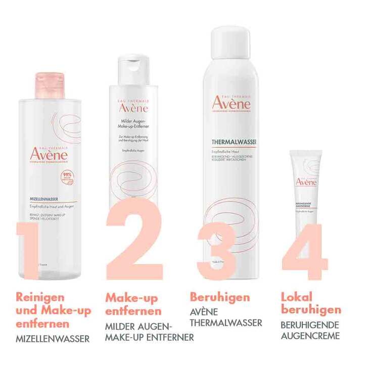Der Milde Augen-Make-up-Entferner – das perfekte Produkt zum Abschminken von wasserlöslichem Augen-Make-up: Besonders milde Tenside entfernen das Augen-Make-up sanft und effektiv. Hydriertes Stärkehydrolysat spendet Feuchtigkeit. Sehr hoher Gehalt an Avene Thermalwasser wirkt hautberuhigend, reizlindernd und entzündungshemmend.