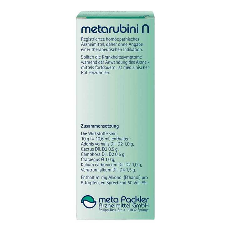 metarubini N Mischung.Anwendungsgebiete: Registriertes homöopathisches Arzneimittel, daher ohne Angabe einer therapeutischen Indikation. Enthält 51 mg Alkohol (Ethanol) pro 5 Tropfen, entsprechend 50 Vol.-%. Zu Risiken und Nebenwirkungen lesen Sie die Packungsbeilage und fragen Sie Ihre Ärztin, Ihren Arzt oder in Ihrer Apotheke. meta Fackler Arzneimittel GmbH, D-31832 Springe.
