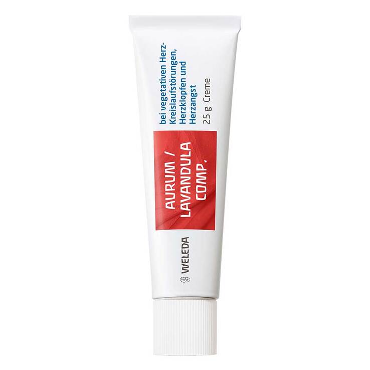 Aurum / Lavandula comp. Creme Warnhinweis: Enthält Lavendelöl – bitte Packungsbeilage beachten. Gemäß der anthroposophischen Menschen- und Naturerkenntnis. Dazu gehören: vegetative Herz-Kreislauf-Störungen, Herzklopfen und Herzangst. Dosierung und Art der Anwendung Soweit nicht anders verordnet, reiben Erwachsene und Jugendliche ab 12 Jahren 1- bis 2-mal täglich (abends und ggf. morgens) einen Cremestrang von 2–3 cm Länge in der Herzgegend in die Haut ein. Bei Kindern von 3–11 Jahren wird 1- bis 2-mal täglich ein Cremestrang von 0,5–1 cm Länge in der Herzgegend in die Haut eingerieben. Zu Risiken und Nebenwirkungen lesen Sie die Packungsbeilage und fragen Sie Ihre Ärztin, Ihren Arzt oder in Ihrer Apotheke. Weleda AG, Schwäbisch Gmünd