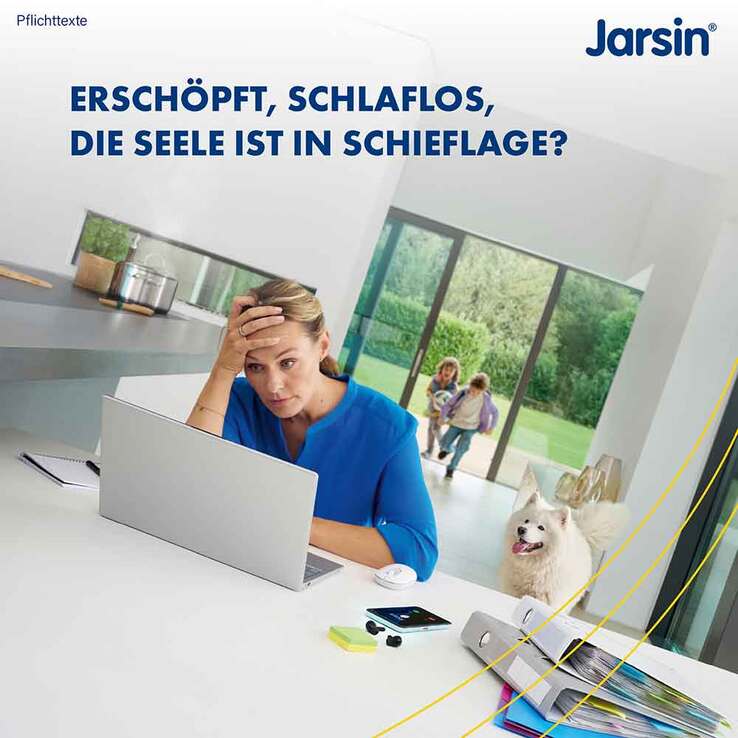 Jarsin® Balance.Wirkstoff: Johanniskraut-Trockenextrakt, Baldrianwurzel-Trockenextrakt Anwendungsgebiete: Traditionelles pflanzliches Arzneimittel zur Behandlung von seelischen Erschöpfungszuständen und damit verbundenen Schlafstörungen. Warnhinweis: Enthält Glucose und Saccharose. Packungsbeilage beachten. Zu Risiken und Nebenwirkungen lesen Sie die Packungsbeilage und fragen Sie Ihre Ärztin, Ihren Arzt oder in Ihrer Apotheke. Stand: Aug-2025
