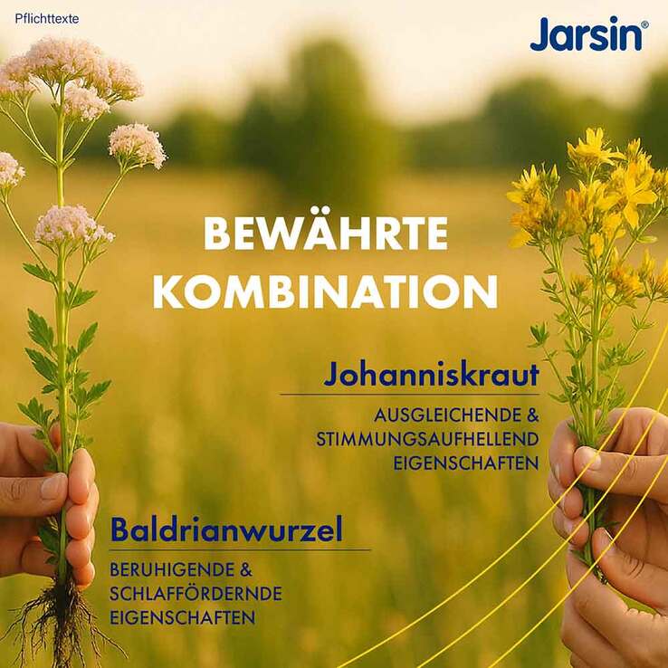 Jarsin® Balance.Wirkstoff: Johanniskraut-Trockenextrakt, Baldrianwurzel-Trockenextrakt Anwendungsgebiete: Traditionelles pflanzliches Arzneimittel zur Behandlung von seelischen Erschöpfungszuständen und damit verbundenen Schlafstörungen. Warnhinweis: Enthält Glucose und Saccharose. Packungsbeilage beachten. Zu Risiken und Nebenwirkungen lesen Sie die Packungsbeilage und fragen Sie Ihre Ärztin, Ihren Arzt oder in Ihrer Apotheke. Stand: Aug-2025
