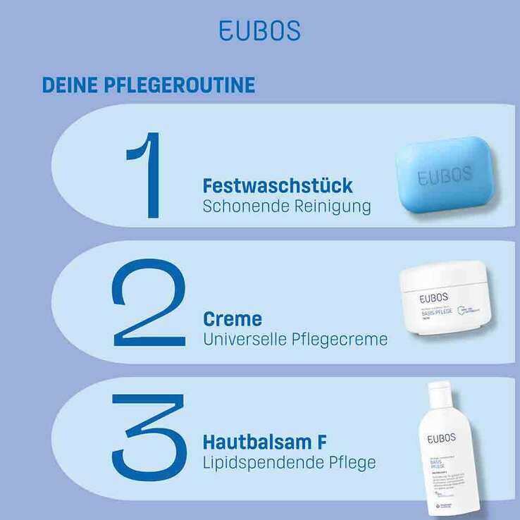 Eubos Hautbalsam F ist eine lipidspendende Pflegelotion für trockene und sehr trockene Haut. Sie enthält 30% natürliche Lipidanteile wie z.B. Jojoba- und Mandelöl. Diese verbessern wesentlich das Einziehen und die Verteilbarkeit der Lotion und pflegen intensiv. Feuchtigkeitsspendende Komponenten stärken die natürliche Barrierefunktion und fördern eine ausgeglichene Feuchtigkeitsbalance. Die ausgezeichnete Verträglichkeit und Wirkung wurde dermatologisch bestätigt. Eine regelmäßige Anwendung erzielt schon nach wenigen Tagen eine deutliche Verbesserung des Hautzustands.