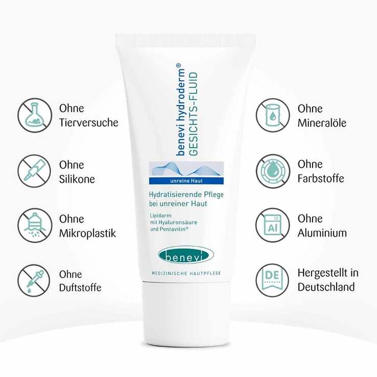 Das Benevi Hydroderm Gesichts-Fluid ist eine milde, nicht komedogene Pflege für unreine, empfindliche oder therapiegestresste Haut. Es ist ein leichtes Feuchtigkeitsfluid für die tägliche Pflege von unreiner oder zu Akne neigender Haut – auch wenn sie durch eine Aknetherapie irritiert oder ausgetrocknet ist. Die nicht komedogene Formulierung zieht schnell ein, ohne zu fetten oder die Poren zu verstopfen.