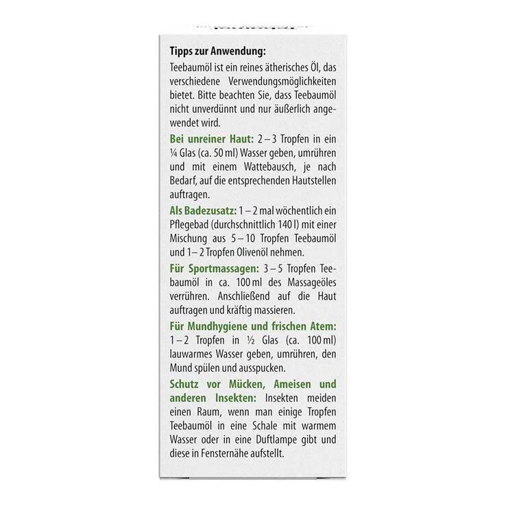 Zur Pflege trockener Haut: 1 – 2 mal wöchentlich ein Pflegebad (durchschnittlich 140 l) mit einer Mischung aus 5 – 10 Tropfen Teebaumöl und 1 – 2 Tropfen Olivenöl nehmen.