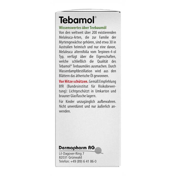 Von den weltweit über 200 existierenden Melaleuca-Arten, die zur Familie der Myrtengewächse gehören, sind etwa 30 in Australien heimisch und nur eine davon, Melaleuca alternifolia vom Terpinen-4-ol Typ, verfügt über die Eigenschaften, welche schließlich die Qualität des Tebamol Teebaumöles ausmachen. Durch Wasserdampfdestillation wird aus den Blättern das ätherische Öl gewonnen. Tebamol in T.T.O.-Qualität übertrifft den strengen australischen ISO/DIS Standard 4730. T.T.O.-Qualität heißt: Laborgeprüft auf Reinheit, 100% naturrein, um 4% Cineol-Gehalt und mind. 35% Terpinen-4-ol-Gehalt.