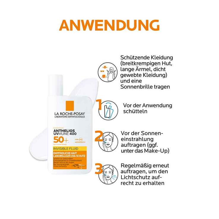 Das Roche Posay Anthelios Invisible Fluid UVMune 400 LSF 50+ (Vorgängerprodukt: PZN 14420846) ist ein Sonnenfluid für sensible und zu Sonnenallergie neigende Gesichtshaut.