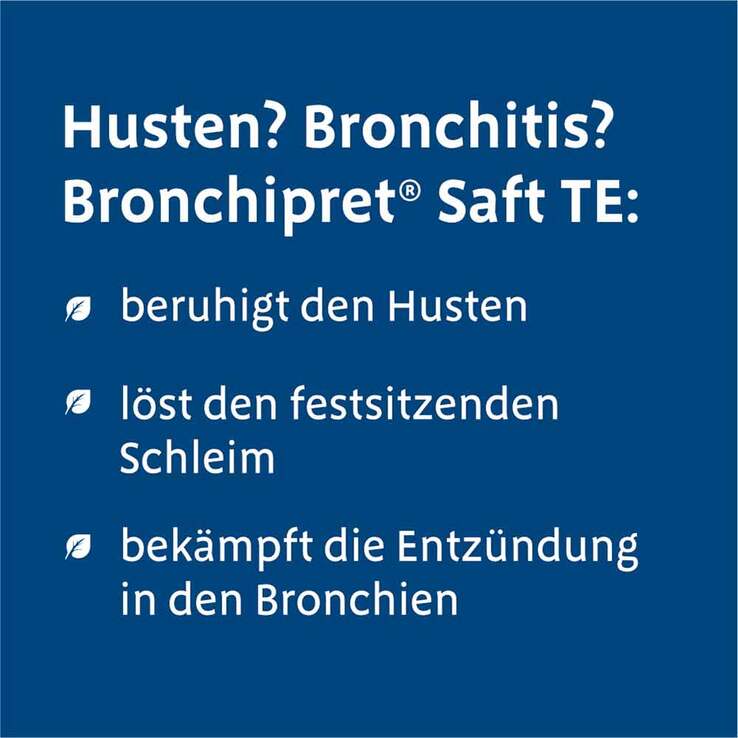 Was ist Bronchipret® Saft TE und wofür wird er angewendet?Das pflanzliche Arzneimittel schafft Abhilfe bei akuter Bronchitis und Husten mit festsitzendem Schleim. Es wirkt mit seinem 3-fach Effekt in allen Phasen der Bronchitis: Es beruhigt den quälenden Husten, löst den festsitzenden Schleim und bekämpft die Entzündungsbeschwerden in den Bronchien.