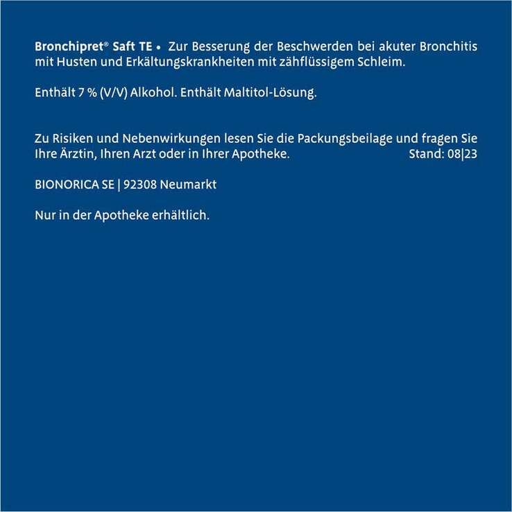 Bronchipret® Saft TE Zur Besserung der Beschwerden bei akuter Bronchitis mit Husten und Erkältungskrankheiten mit zähflüssigem Schleim. Bronchipret® Saft TE enthält 7 % (V/V) Alkohol. Zu Risiken und Nebenwirkungen lesen Sie die Packungsbeilage und fragen Sie Ihre Ärztin, Ihren Arzt oder in Ihrer Apotheke. Stand: 01|23 BIONORICA SE | 92308 Neumarkt