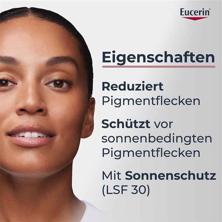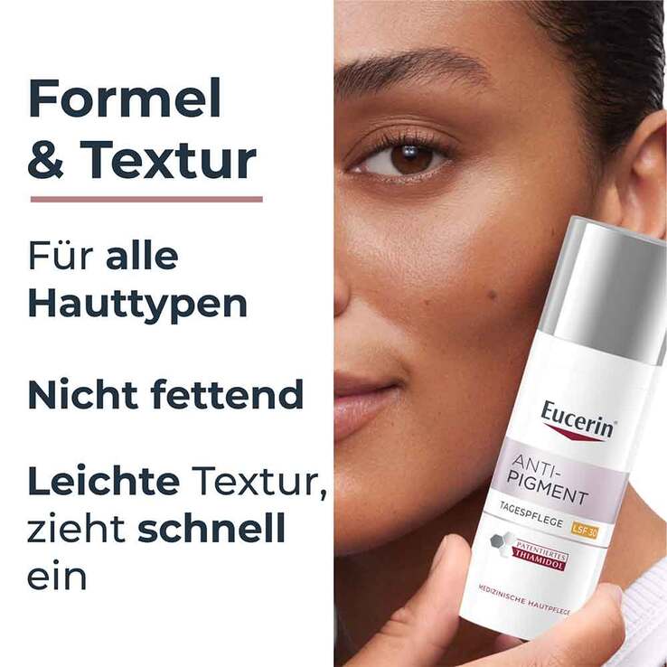 Die Eucerin Anti-Pigment Tagespflege LSF 30 mit leichter, schnell einziehender Textur hilft wirksam bei Pigmentflecken und sogenannter Altersflecken. Sie mildert Pigmentflecken effektiv und schützt vor ihrer Neuentstehung – für einen gleichmäßigen Hautton. Mit dem patentierten Wirkstoff Thiamidol® wirkt die Tagescreme effektiv am Ursprung von Pigmentflecken und trägt bei regelmäßiger Anwendung sichtbar zu deren Milderung bei. Erste Ergebnisse sind schon nach 2 Wochen sichtbar, sie verbessern sich bei kontinuierlicher Anwendung stetig weiter.