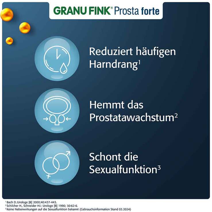 Dabei schont GRANU FINK® Prosta forte 500 mg die Sexualfunktion.3Das pflanzliche Arzneimittel verbindet klinisch bewiesene Wirksamkeit1 mit sehr guter Verträglichkeit. Es sind darüber hinaus keine Wechselwirkungen mit anderen Medikamenten bekannt.