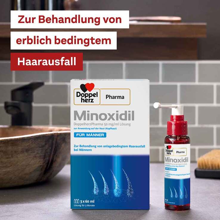 MINOXIDIL DoppelherzPharma 50 mg/ml Lösung zur Anwendung auf der Haut (Kopfhaut).Wirkstoff: Minoxidil. Zusammensetz.: 1 ml Lös. enth. 50 mg Minoxidil. Anwendungsgebiete: Das Arzneim. stabilisiert d. Verlauf d. anlagebedingten Haarverlustes (androgenetische Alopezie) im Tonsurbereich d. Kopfhaut von 3 – 10 cm Durchmesser bei erwachsenen Männern zwischen 18 u. 49 J. Die Behandl. kann so d. Fortschreiten d. anlagebedingten Haarverlustes entgegenwirken. Beginn u. Ausmaß d. Wirk. können individ. unterschiedl. sein u. sind nicht vorhersagbar. Warnhinweise: Dieses Arzneimittel enth. Propylenglycol. Zu Risiken und Nebenwirkungen lesen Sie die Packungsbeilage und fragen Sie Ihre Ärztin, Ihren Arzt oder in Ihrer Apotheke. (Stand 09/2024