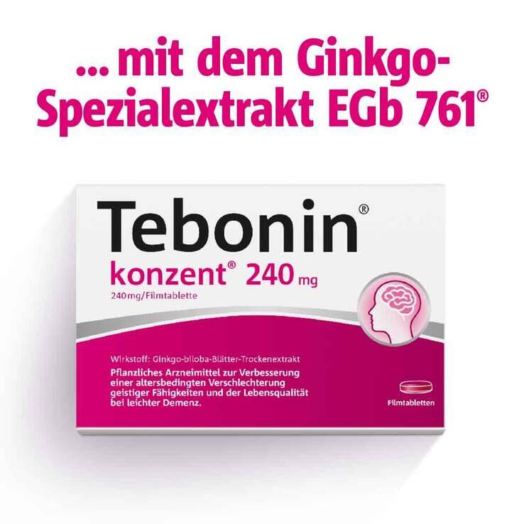 Tebonin® konzent® 240 mg. Wirkstoff: Ginkgo-biloba-Blätter-Trockenextrakt. Zur Verbesserung einer altersbedingten Verschlechterung geistiger Fähigkeiten und der Lebensqualität bei leichter Demenz. Zu Risiken und Nebenwirkungen lesen Sie die Packungsbeilage und fragen Sie Ihre Ärztin, Ihren Arzt oder in Ihrer Apotheke. Dr. Willmar Schwabe GmbH & Co. KG - Karlsruhe
