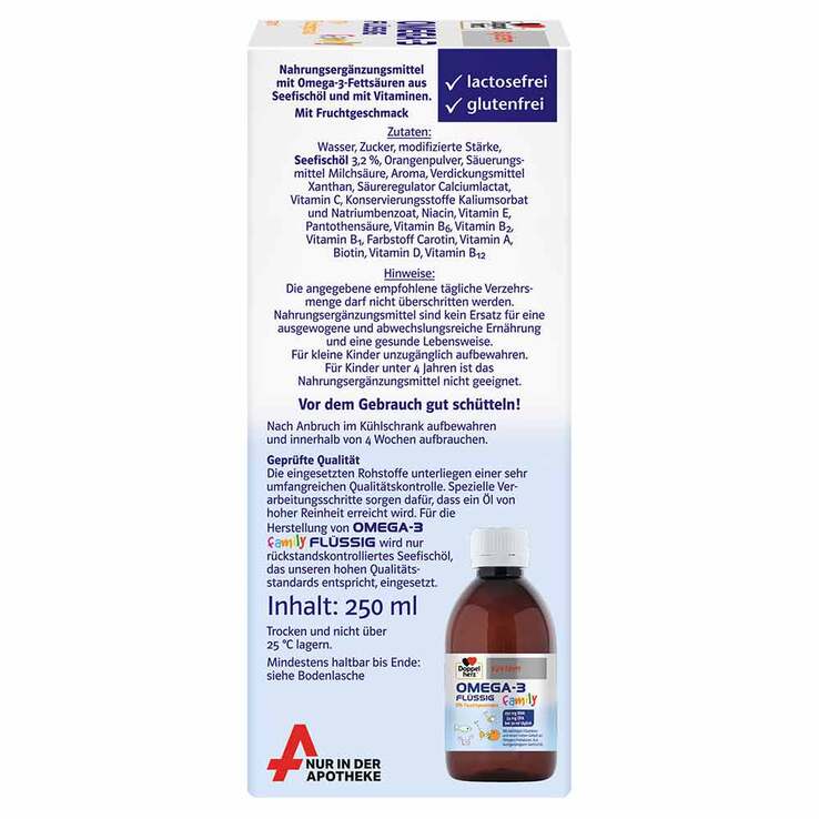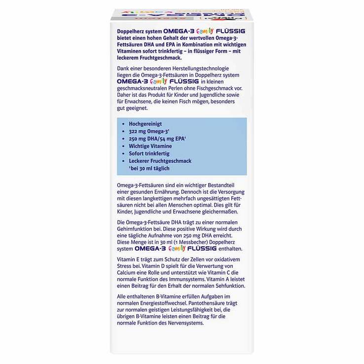 Doppelherz system Omega-3 family flüssig bietet einen hohen Gehalt der wertvollen Omega-3-Fettsäuren DHA und EPA in Kombination mit wichtigen Vitaminen sofort trinkfertig – in flüssiger Form – mit leckerem Fruchtgeschmack.