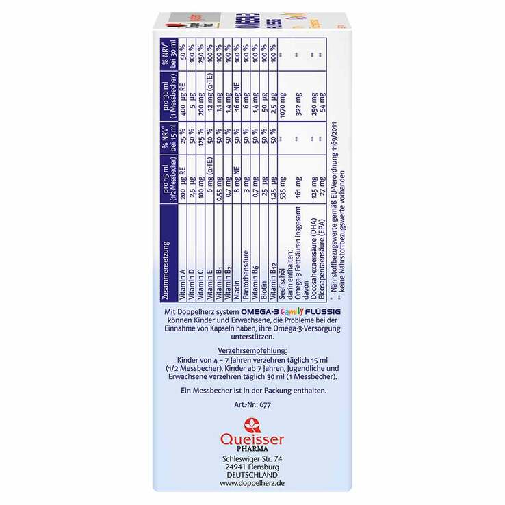 Das flüssige Nahrungsergänzungsmitttel von Doppelherz enthält neben den wichtigen Omega- 3-Fettsäuren noch die fettlöslichen Vitamine A, D, und E sowie die wasserlöslichen B-Vitamine und Vitamin C.