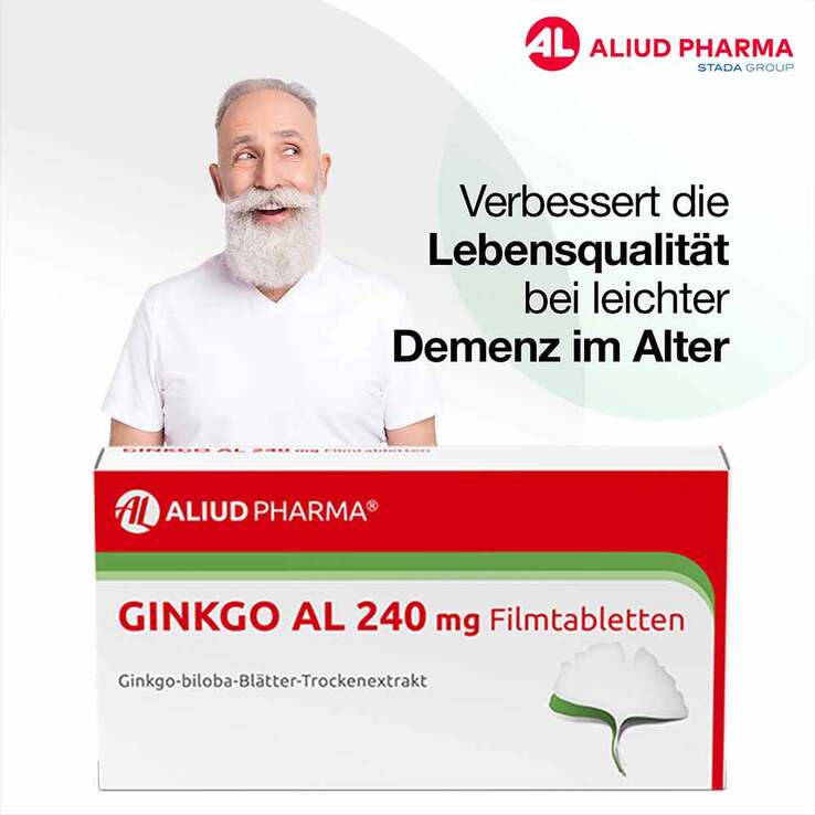 GINKGO AL 240 mg Filmtabletten. Zur Anwendung bei Erwachsenen. Wirkstoff: Ginkgo-biloba-Blätter-Trockenextrakt. Pflanzliches Arzneimittel zur Verbesserung einer altersbedingten kognitiven Beeinträchtigung und der Lebensqualität bei leichter Demenz. Enthält Lactose und Glucose. Zu Risiken und Nebenwirkungen lesen Sie die Packungsbeilage und fragen Sie Ihre Ärztin, Ihren Arzt oder in Ihrer Apotheke. ALIUD PHARMA® GmbH, Postfach 1380, 89146 Laichingen. Stand: Juni 2020