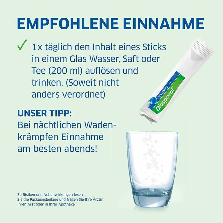 Magnesium Diasporal® 300 mg, Granulat zur Herstellung einer Lösung zum Einnehmen (Wirkstoff: Magnesiumcitrat) Anwendungsgebiet: Behandlung und Vorbeugung eines Magnesiummangels. Enthält Saccharose (Zucker) und Natrium. Zu Risiken und Nebenwirkungen lesen Sie die Packungsbeilage und fragen Sie Ihre Ärztin, Ihren Arzt oder in Ihrer Apotheke. Protina Pharm. GmbH, 85737 Ismaning