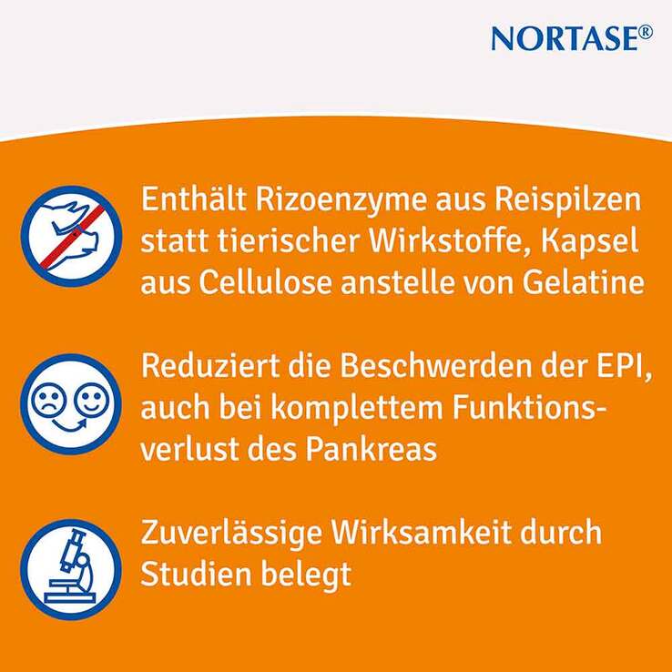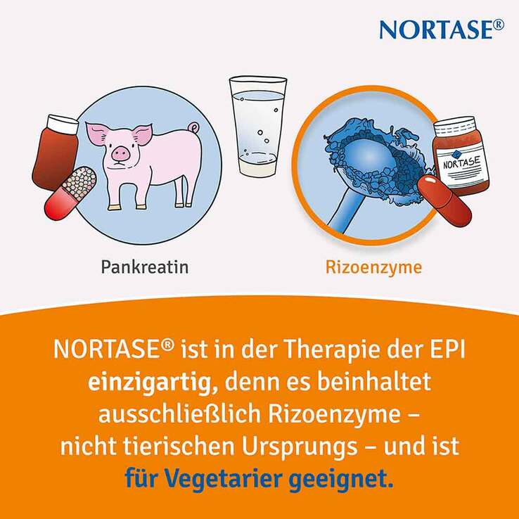 NORTASE® Anwendungsgebiete: Ersatz von Verdauungsenzymen bei Maldigestion (Verdauungsschwäche) infolge einer gestörten Funktion der Bauchspeicheldrüse. Enthält Lactose. Zu Risiken und Nebenwirkungen lesen Sie die Packungsbeilage und fragen Sie Ihre Ärztin, Ihren Arzt oder in Ihrer Apotheke. Stand 03/21.