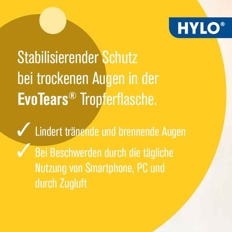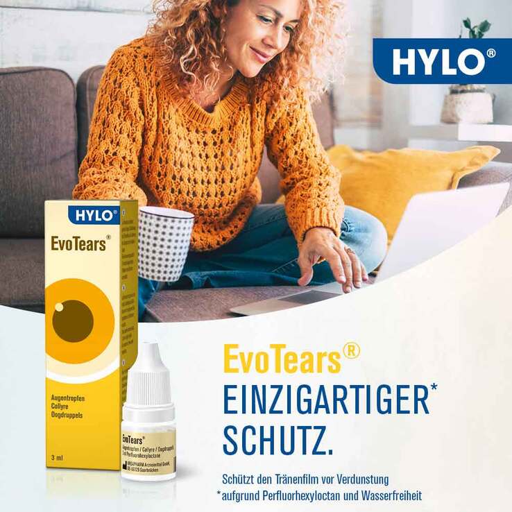 Die ersten wasserfreien Augentropfen sind sehr gut zur Linderung der Symptome des Trockenen Auges. Mit dem Inhaltsstoff Perfluorhexyloctan ersetzen sie nicht den wässrigen Teil des Tränenfilms, sondern legen sich wie ein Schutzmantel über ihn und können so einer vorzeitigen Verdunstung vorbeugen. Durch ihre besonderen Fließeigenschaften gibt es EvoTears® in einer praktischen Tropferflasche, in der auch ohne Konservierungsmittel keine Keime entstehen können. Dadurch sind sie gut verträglich und nach Anbruch 6 Monate haltbar.