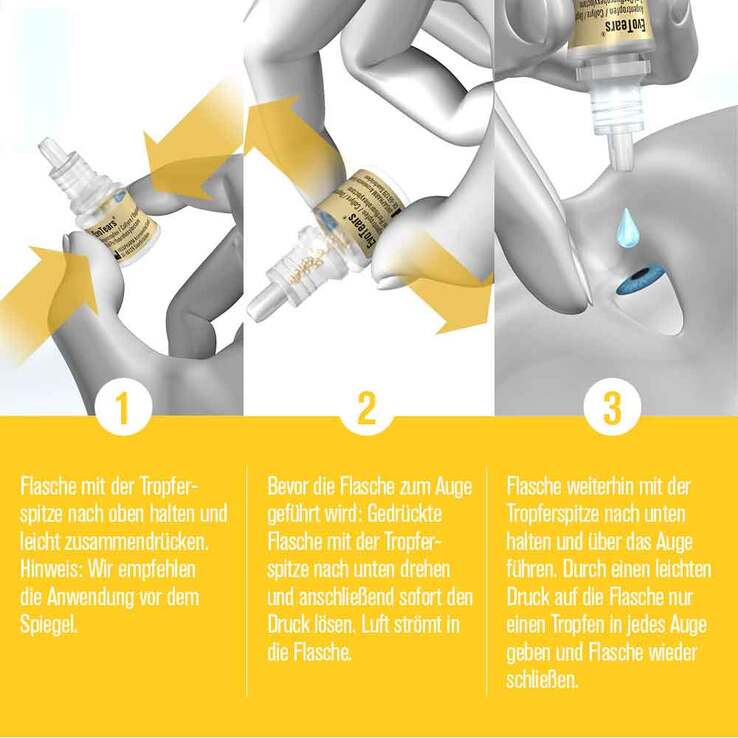 Bevor die Flasche zum Auge geführt wird: gedrückte Flasche mit Tropferspitze nach unten drehen und anschließend sofort den Druck lösen. Luft strömt in die Flasche.