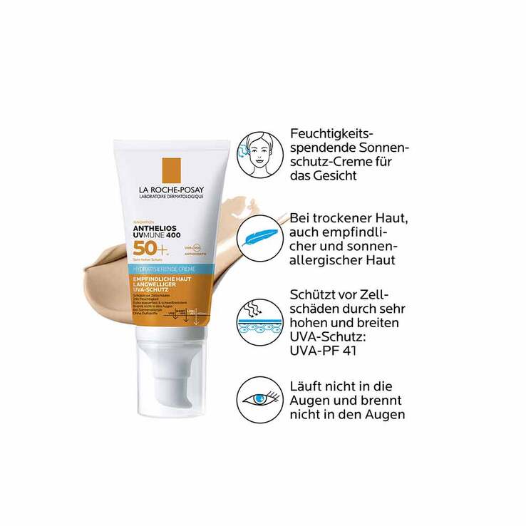 Die Roche Posay Anthelios hydratisierende getönte BB-Creme UVMune 400 LSF 50+ von La Roche Posay (ehem. Anthelios hydratisierende getönte BB-Creme LSF 50+, PZN: 13868786) schützt die Haut vor langwelligen UVA-Strahlen und beugt Zellschäden vor. Die Creme ist getönt und feuchtigkeitsspendend und eignet sich als Sonnencreme für empfindliche und trockene Gesichtshaut.