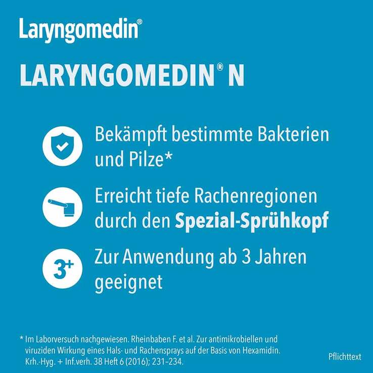 Laryngomedin® N. Wirkstoff: Hexamidindiisetionat. Anwendungsgebiete: Laryngomedin® N wird angewendet zur unterstützenden Behandlung von bakteriellen Entzündungen der Schleimhaut von Mund und Rachen. Zu Risiken und Nebenwirkungen lesen Sie die Packungsbeilage und fragen Sie Ihre Ärztin, Ihren Arzt oder in Ihrer Apotheke.
