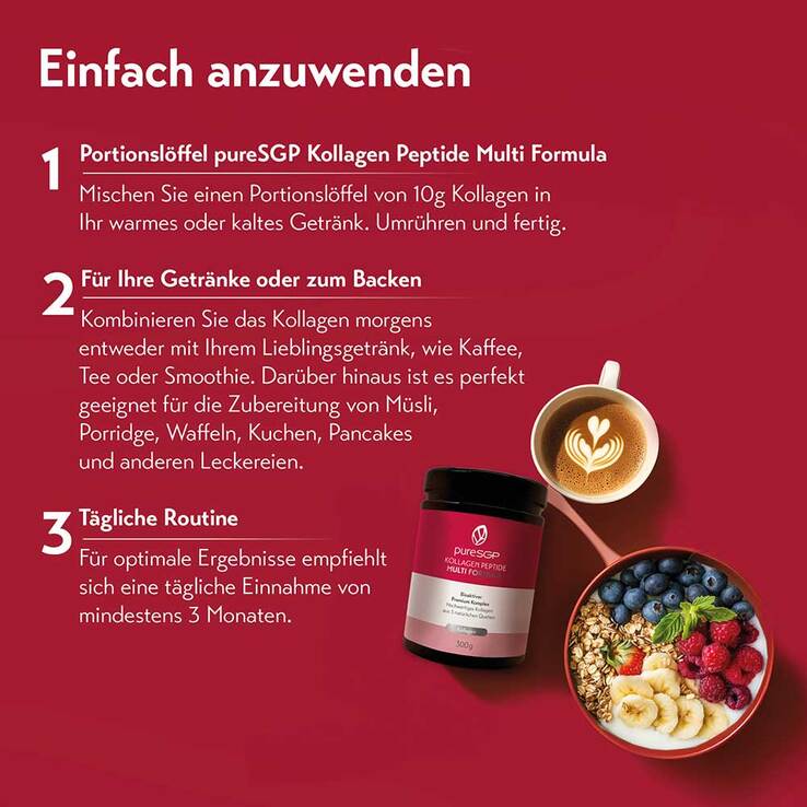 Täglich einen gestrichenen Portionslöffel (= 10 g) in Wasser, Tee, Kaffee, Smoothies oder Suppen einrühren.