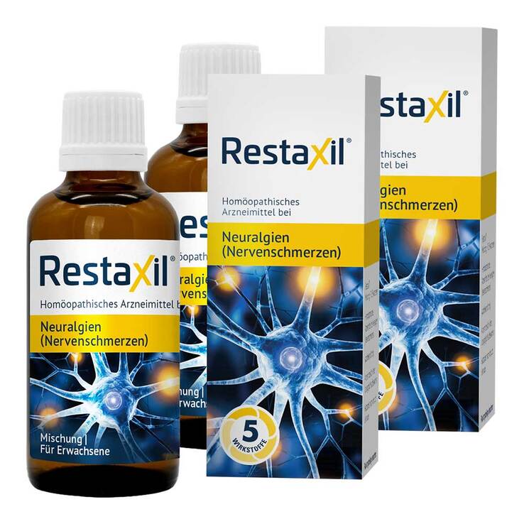 Pflichtangaben:Restaxil. Wirkstoffe: Gelsemium sempervirens Dil. D2, Spigelia anthelmia Dil. D2, Iris versicolor Dil. D2, Cyclamen purpurascens Dil. D3, Cimicifuga racemosa Dil. D2. Homöopathisches Arzneimittel bei Neuralgien (Nervenschmerzen). Zu Risiken und Nebenwirkungen lesen Sie die Packungsbeilage und fragen Sie Ihre Ärztin, Ihren Arzt oder in Ihrer Apotheke. Pharmazeutischer Hersteller: Restaxil GmbH, 82166 Gräfelfing.