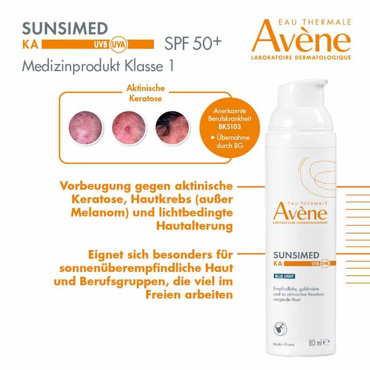 Sunsimed KA ist ein Medizinprodukt mit sehr hohem Sonnenschutz SPF 50+, das dazu beiträgt, Krebsläsionen (außer Melanom) und Krebsvorstufen wie aktinische Keratose und UV-lichtinduzierte DNA-Läsionen zu verhindern. Sunsimed KA wurde formuliert mit: