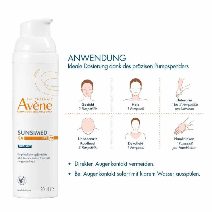 Morgens gleichmäßig auf Gesicht und die tagsüber sonnenexponierten Körperzonen auftragen. Bei längerer Sonnenexposition, starkem Schwitzen oder Kontakt mit Wasser erneut auftragen. Insgesamt nicht mehr als 26 Pumpstöße pro Tag.