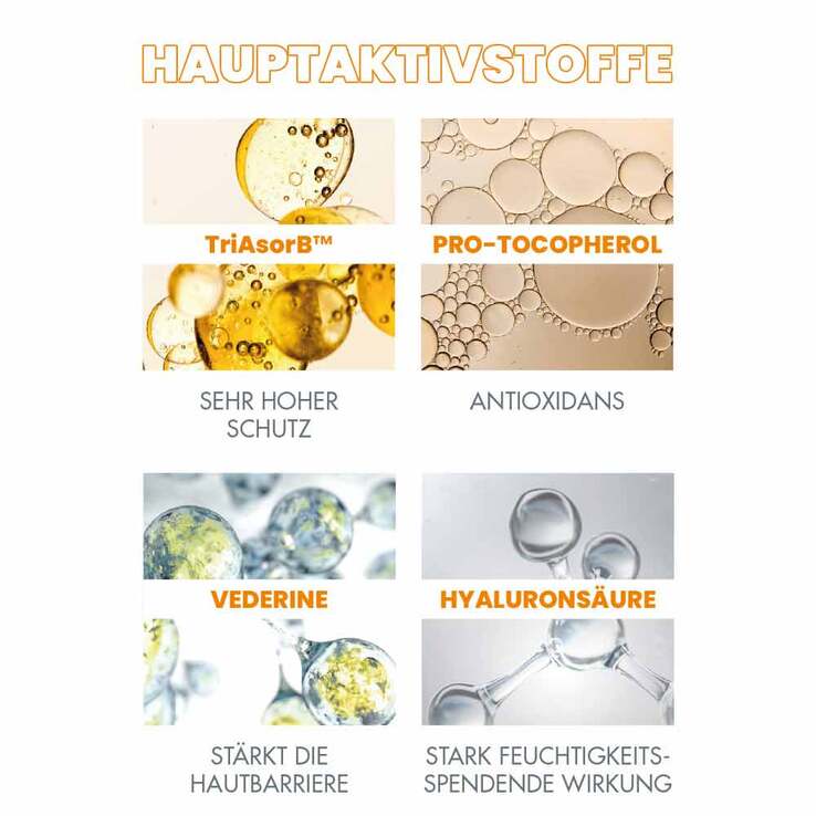 [TriAsorB™]: 1. organischer Sonnenfilter, bewahrt die Haut vor UVB- und UVA-Strahlen. Er schützt auch vor dem kurzwelligen blauen Anteil des Tageslichts, dem sogenannten HEV-Blue-Light und bietet somit einen zusätzlichen Schutz vor Hautalterung und Hyperpigmentierung infolge kurzwelligem Blue Light.
