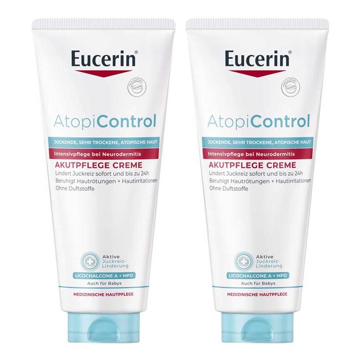 Die Eucerin AtopiControl Akutpflege Creme wurde speziell für zur Neurodermitis Behandlung entwickelt. Sie lindert bei akuten Schubphasen wirksam den Juckreiz, Hautentzündung sowie Spannungsgefühl und beruhigt die Haut. Die Creme kann so oft wie nötig zur Hautpflege auf die betroffenen Hautstellen aufgetragen werden, um Linderung zu verschaffen.