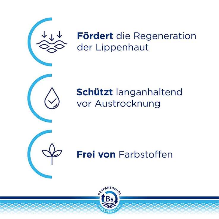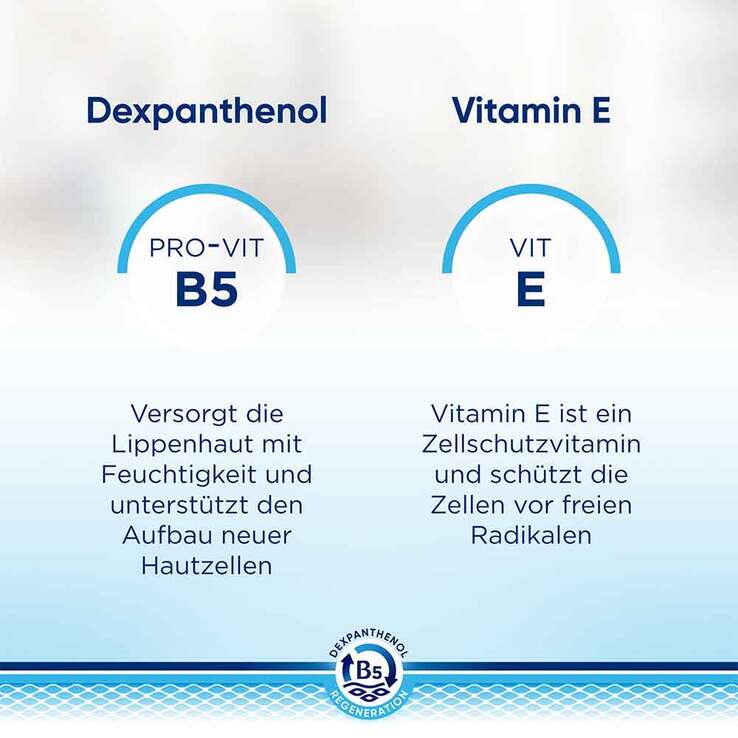 - Dexpanthenol stellt den Lippen Feuchtigkeit zur Verfügung und unterstützt die Haut gleichzeitig bei der Produktion neuer Zellen.