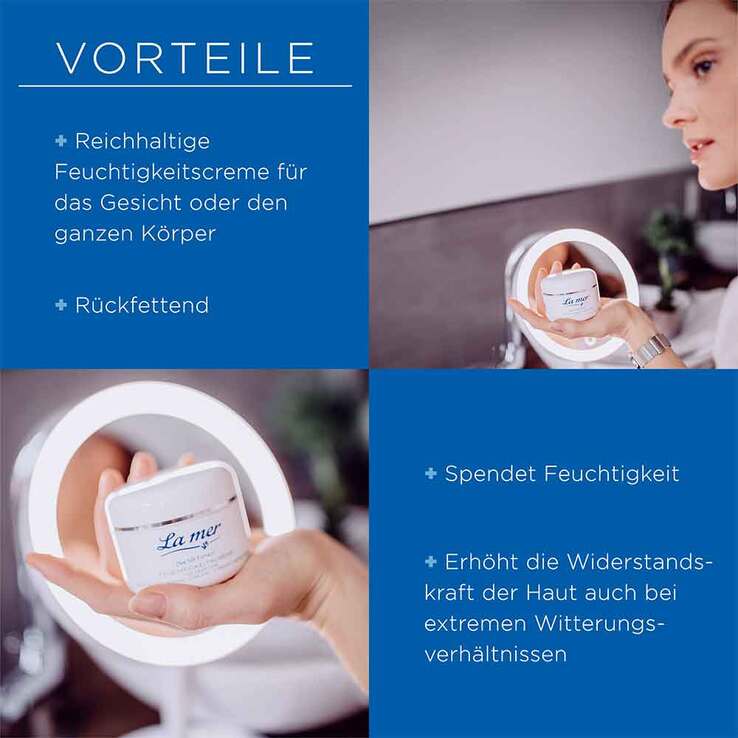 La mer Feuchtigkeitscreme eignet sich ideal als Tagescreme für das Gesicht oder den ganzen Körper – sogar bei empfindlicher Haut.