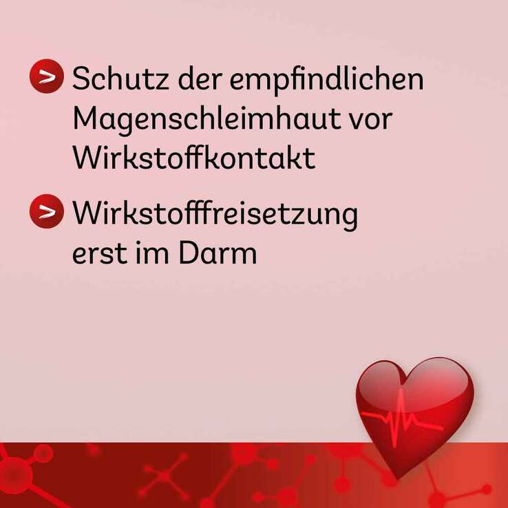 Wirkstoff: Acetylsalicylsäure Anwendungsgebiete: Symptomatische Behandlung von instabiler Angina pectoris u. akutem Myokardinfarkt - als Teil der Standardtherapie, Reinfarktprophylaxe; nach arteriellen gefäßchirurgischen oder interventionellen Eingriffen z. B. nach ACVB, bei PTCA; Vorbeugung von transitorischen ischämischen Attacken (TIA) u. Hirninfarkten, nachdem Vorläuferstadien aufgetreten sind. Warnhinweis: Enthält Lactose. Packungsbeilage beachten. Zu Risiken und Nebenwirkungen lesen Sie die Packungsbeilage und fragen Sie Ihre Ärztin, Ihren Arzt oder in Ihrer Apotheke.