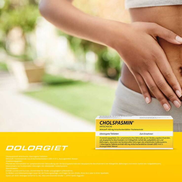 Cholspasmin® Artischocke ist pflanzlichen Ursprungs und für die Anwendung im Verdauungstrakt entwickelt.Pflichtangaben:Cholspasmin® Artischocke, überzogene Tabletten.Wirkstoff: Trockenextrakt aus Artischockenblättern (DEV 4–6:1), Auszugsmittel: Wasser.Anwendungsgebiet:Pflanzliches Arzneimittel zur symptomatischen Behandlung von Verdauungsbeschwerden (dyspeptische Beschwerden) mit Völlegefühl, Blähungen und einem Gefühl des Aufgeblähtseins, insbesondere bei funktionellen Störungen des ableitenden Gallensystems.Warnhinweise:Enthält Lactose und Sucrose. Arzneimittel für Kinder unzugänglich aufbewahren.Zu Risiken und Nebenwirkungen lesen Sie die Packungsbeilage und fragen Sie Ihre Ärztin, Ihren Arzt oder in Ihrer Apotheke.Stand: Juli 2024. Dolorgiet GmbH & Co. KG, Otto-von-Guericke-Straße 1, 53757 Sankt Augustin.