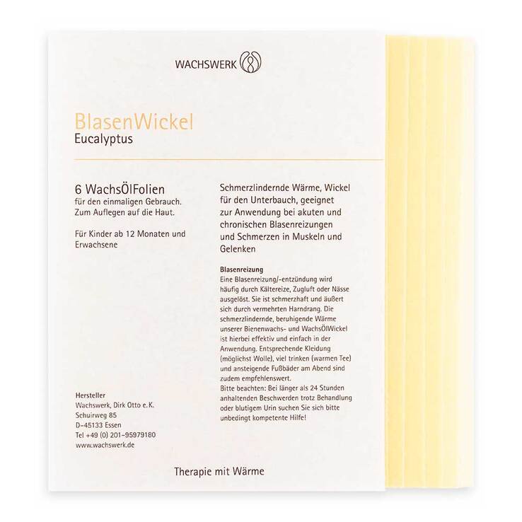 Eine Folie der Packung entnehmen (ggf. zuschneiden) und kurz zwischen den Händen oder mit einem Föhn auf Körpertemperatur anwärmen. Direkt auf die Haut im Blasenbereich legen und mit dem SchafWoll- Vlies zudecken. Zur Intensivierung der Anwendung empfiehlt sich für Kinder ab dem 5. Lebensjahr und Erwachsene die zusätzliche Wärmezufuhr mit einem trockenen Wärmekissen (separat erhältlich). Der Wickel wird gegen Verrutschen mit eng anliegender Kleidung oder dem Wachswerk-Wollschal fixiert.